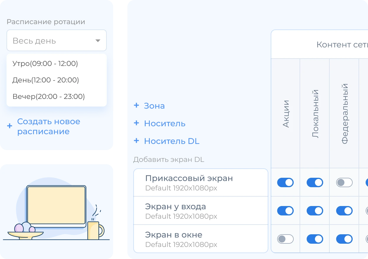 Система RetailRotor разработана для удобного управления большой сетью экранов и контроля над ней. Мы предусмотрели всё необходимое: